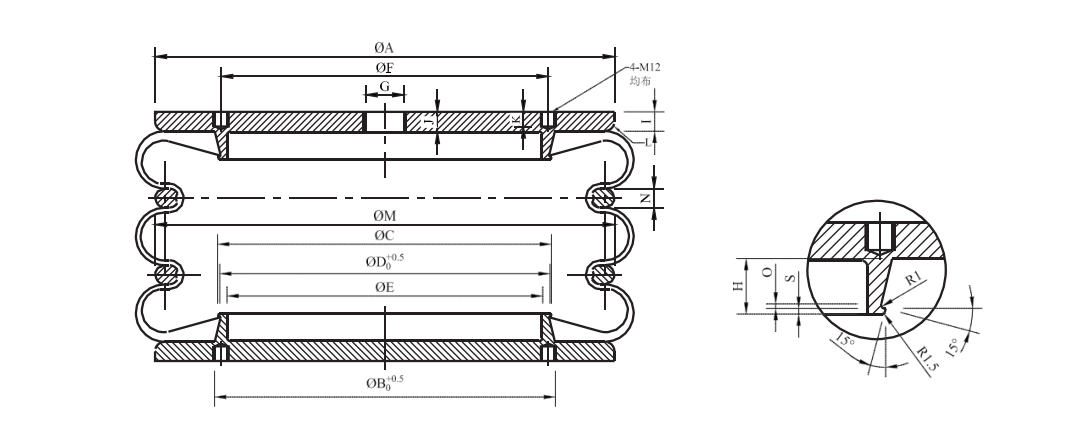 自封式,是因其無需外力自行密封而得名。如圖,用纖維層做補強處理的橡膠曲囊①在使用時,將防止膨脹的鋼制(鍍鋅)腰環(huán)②嵌在其中。③蓋板的端部鋼絲圈借助空氣內(nèi)壓的作用,使橡膠口部發(fā)生變形與上下蓋板(鍍鋅)④密切接觸,從而可防止空氣泄漏。上下蓋板④通過機械加工成型。⑤是用于安裝進(jìn)氣管路的管螺紋進(jìn)氣孔,⑥則是安裝用的標(biāo)準(zhǔn)螺紋孔。