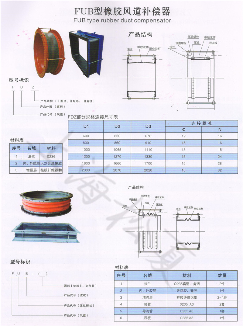 風道橡膠補償器分為FDZ、FVB、FUB、XB四種型號,由橡膠和橡膠一纖維織物復合材料、鋼制法蘭、套筒、保溫隔熱材料組成,主要用于各種風機、風管之間的柔性連接,其功能是減震、降噪、密封、耐介質、便于位移和安裝,是環境保護領域中一種極為理想的減震、降噪、消煙除塵的最佳配套件。