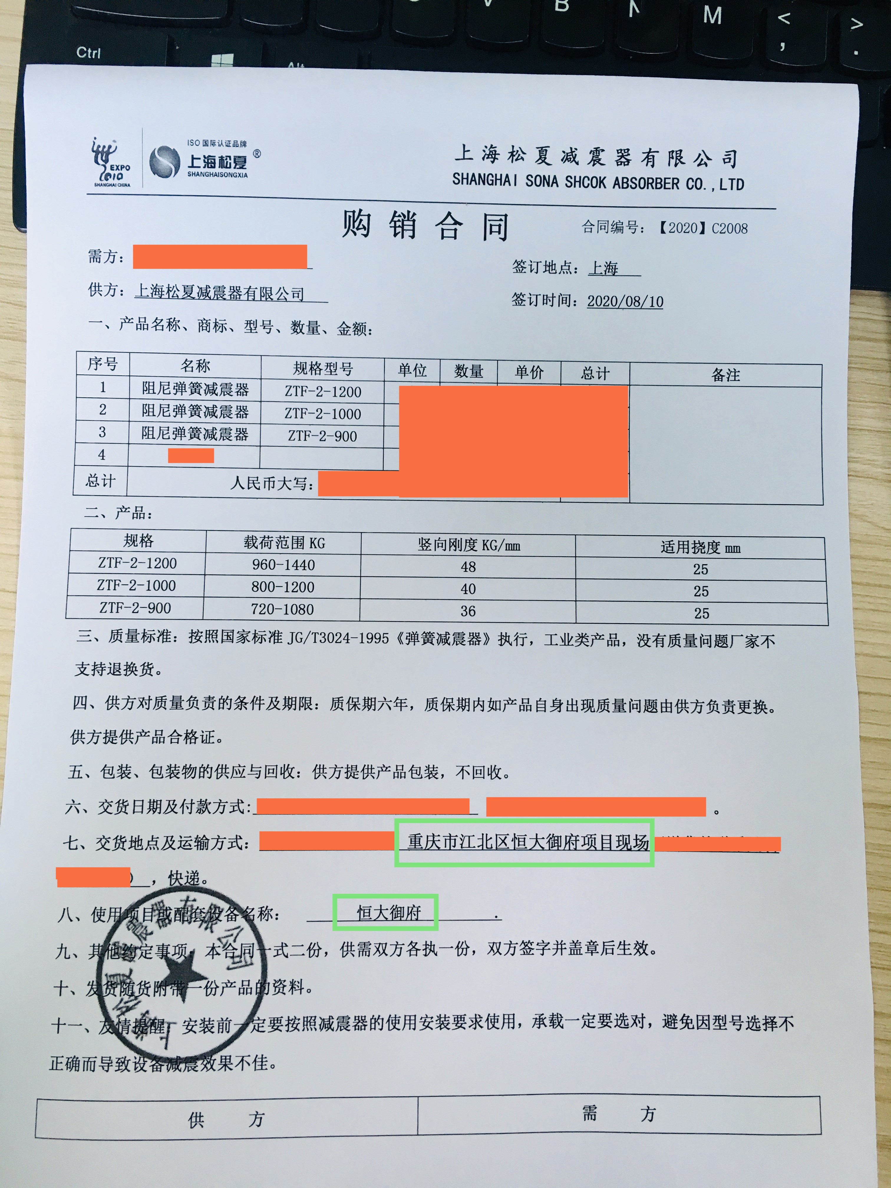 上海松夏減震器有限公司官方網(wǎng)站為您介紹:【恒大御府配套】上海松夏阻尼彈簧減震器采購(gòu)合同信息,我們松夏公司2020年為【恒大御府配套】上海松夏阻尼彈簧減震器,起到了減震和降噪的作用,以下是【恒大御府配套】上海松夏阻尼彈簧減震器采購(gòu)合同介紹。